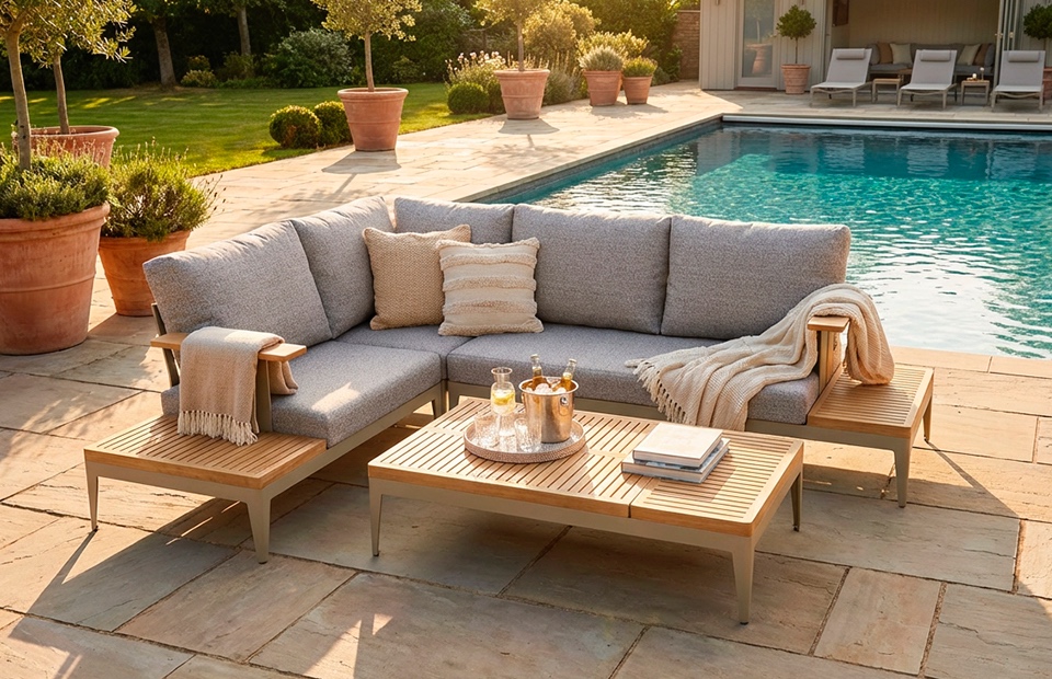 Mit der Sunshine Lounge können Sie Ihren Aussenbereich in eine entspannte Wohlfühloase verwandeln. Geniessen Sie gemütliche Stunden im Freien und laden Sie Freunde und Familie ein, gemeinsam schöne Momente zu verbringen. Die pflegeleichten Materialien garantieren eine lange Lebensdauer und machen diese Ecklounge zu einem langlebigen Begleiter.